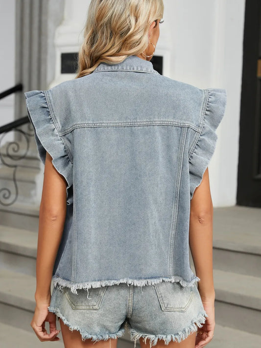 Raw Hem Pearl Trim Collared Neck Denim Top