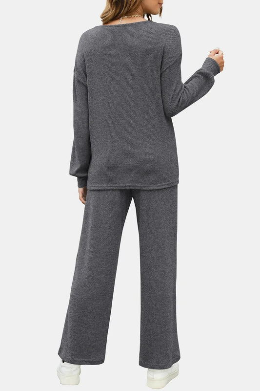 Ribbed V-Neck Long Sleeve Top and Pocketed Pants Set